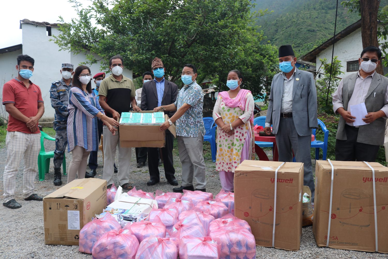 आइतबार घर्तीगाउँमा अक्सिजन कन्सन्ट्रेटर १ थान, एन ९५ मास्क १ सय वटा, सर्जिकल मास्क ३ हजार वटा, एन्टिजिन किट १ सय वटा र पिपिई २ सेट माडी र गंगादेव गाउँपालिकालाई समान परिमाणमा हस्तान्तरण गरिएको छ भने जिल्लाको परिवर्तन, थबाङ, त्रिवेणी र रुन्टीगढी गाउँपालिकालाई पनि सोही अनुपातमा वितरण गरिने बताइएको छ ।